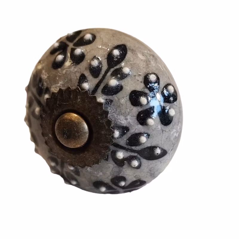 Dekorativ knopp med bladliknande dekor i grå/svart färg med små vita prickar. Alla knoppar är handgjorda så mönstret varierat något från knopp till knopp.Monter