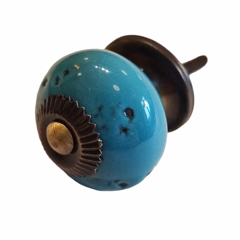 Dekorativ knopp i turkos. Alla knoppar är handgjorda så mönstret varierat något från knopp till knopp.Montera knoppen med medföljande skruv på önskad låda, luck