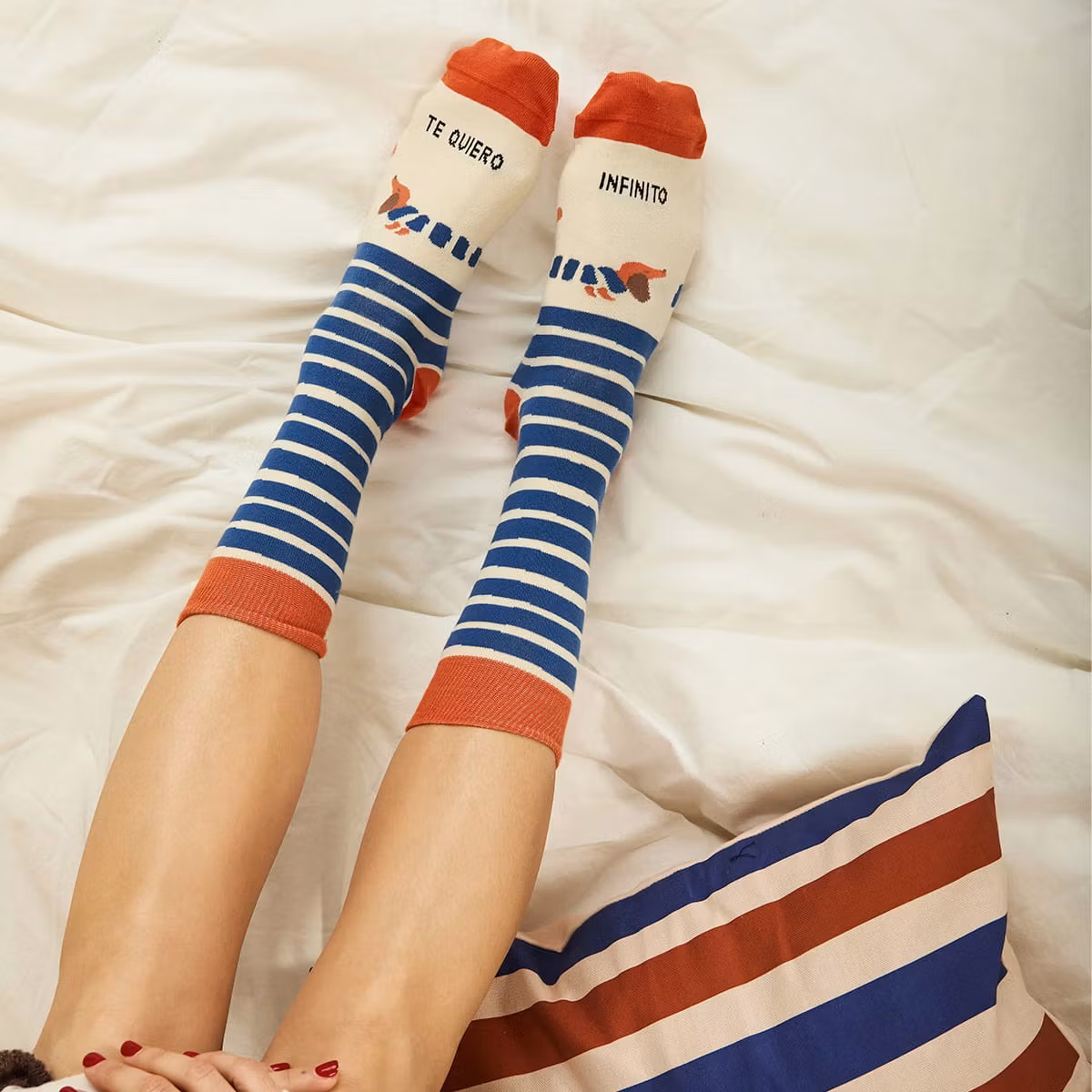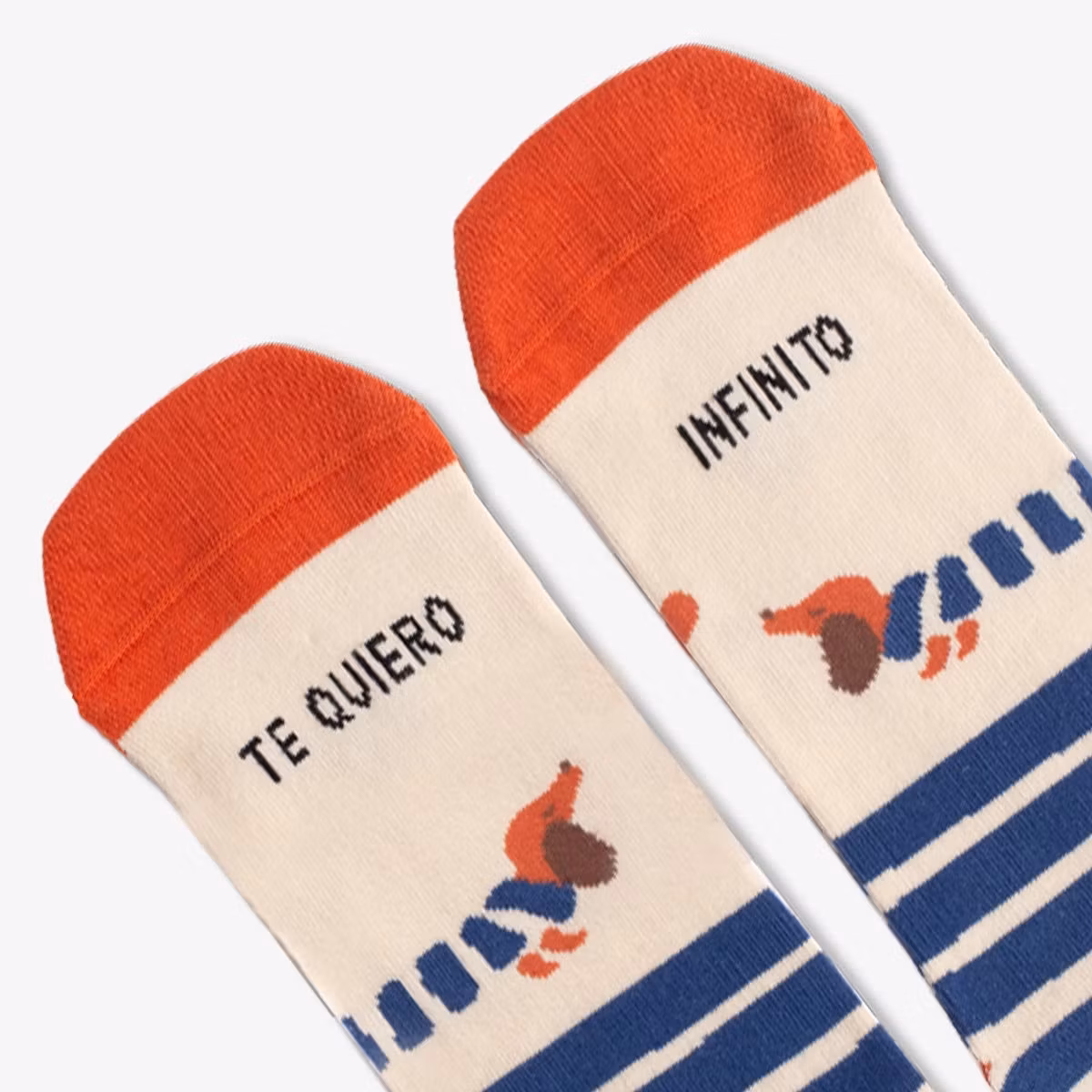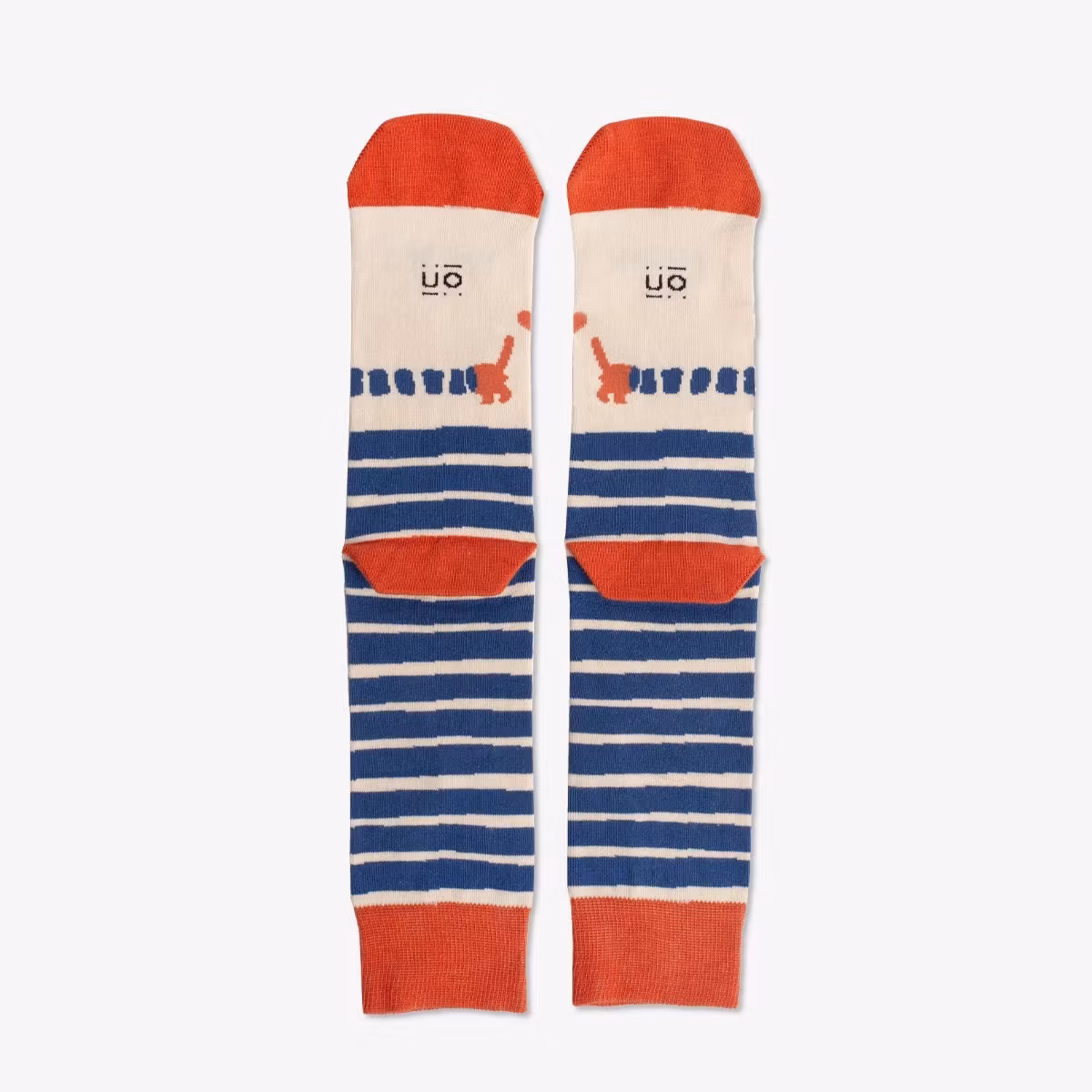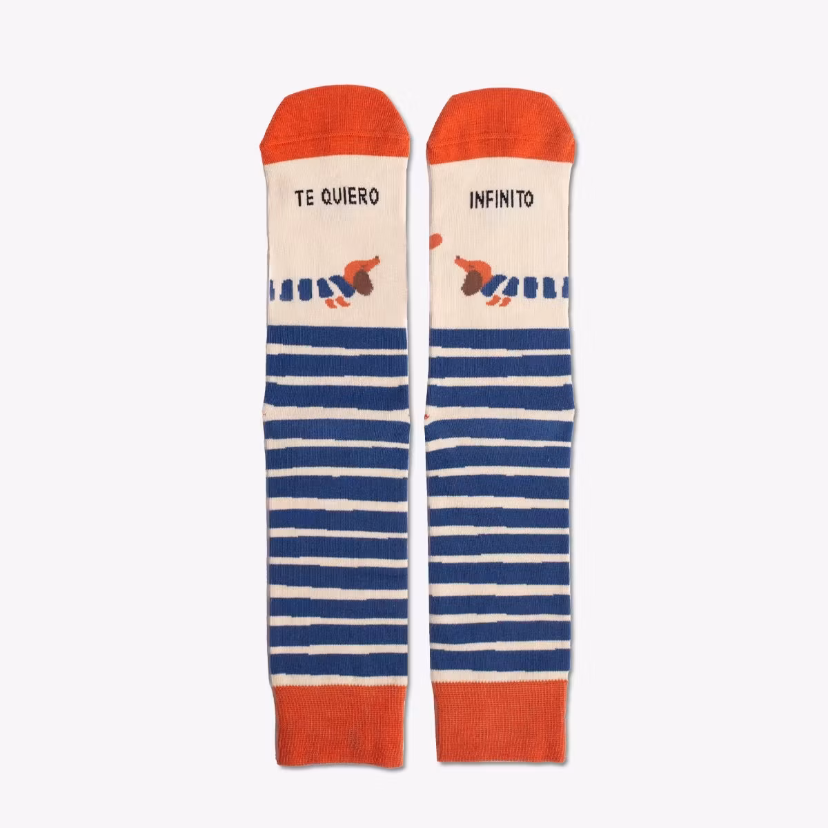 Randiga strumpor i offwhite och blått med taxmotiv och orange detaljer. Tillverkade i Portugal i bomull, polyamid och elastan. Storlek 36–41.