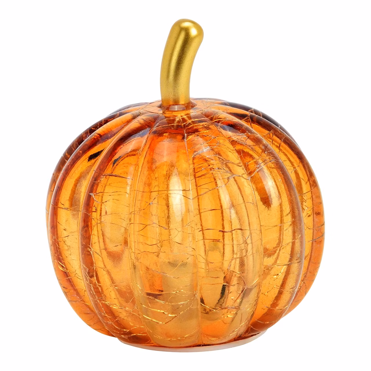 En liten nätt pumpa i glas med inbyggd LED-ljusslinga och timerfunktion. Perfekt för höstmys och halloween!