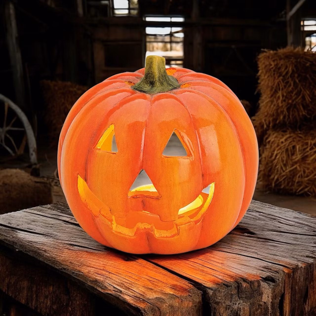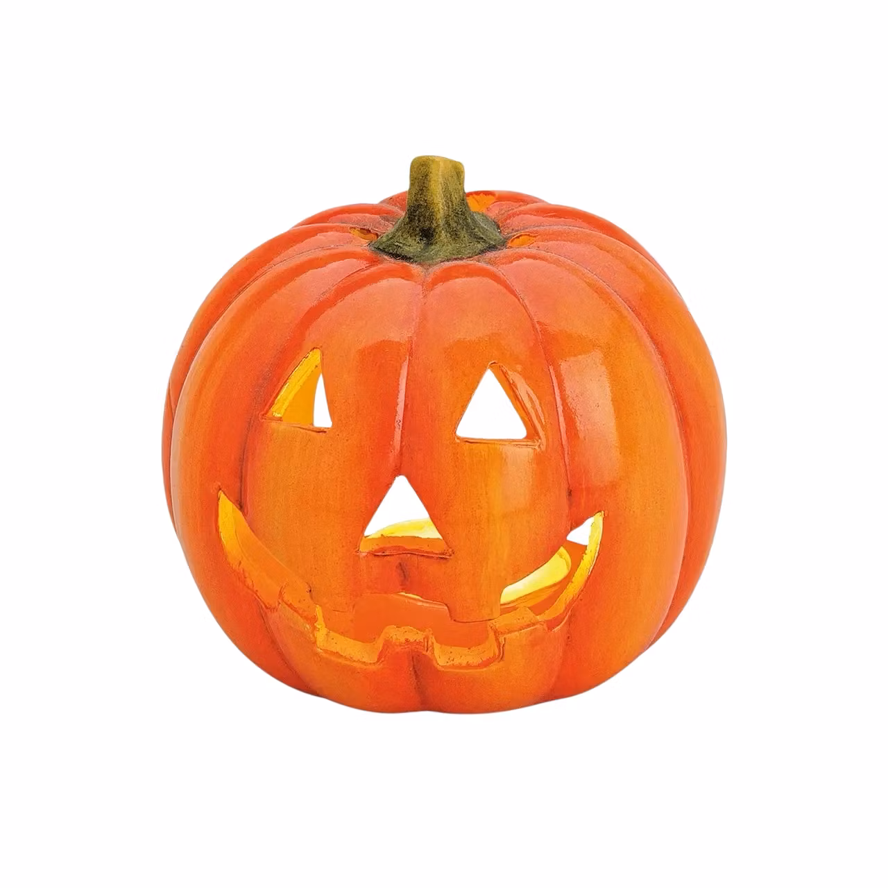 Pumpa i keramik med ögon och mun där ljuset lyser igenom. Vacker orange färg – perfekt för höstmys och halloween.