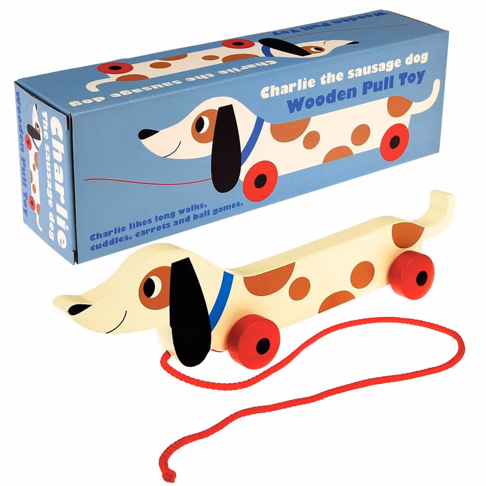 Klassisk leksak i trä "CHARLIE THE SAUSAGE DOG" när den är som bäst. Perfekt present till det lilla barnet eller till den taxtokige!