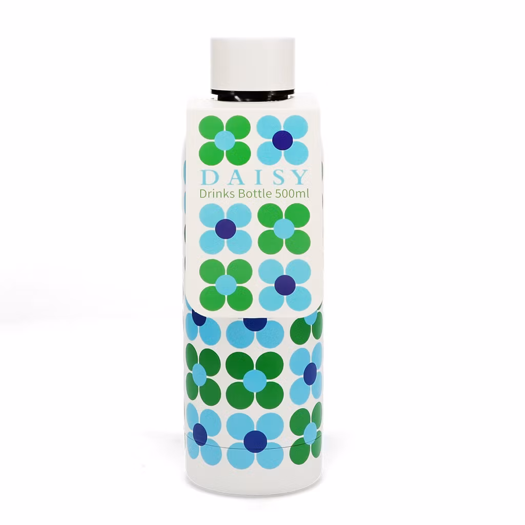 Miljövänlig vattenflaska i rostfritt stål i vitt, prydd med blommor i blått och grönt.