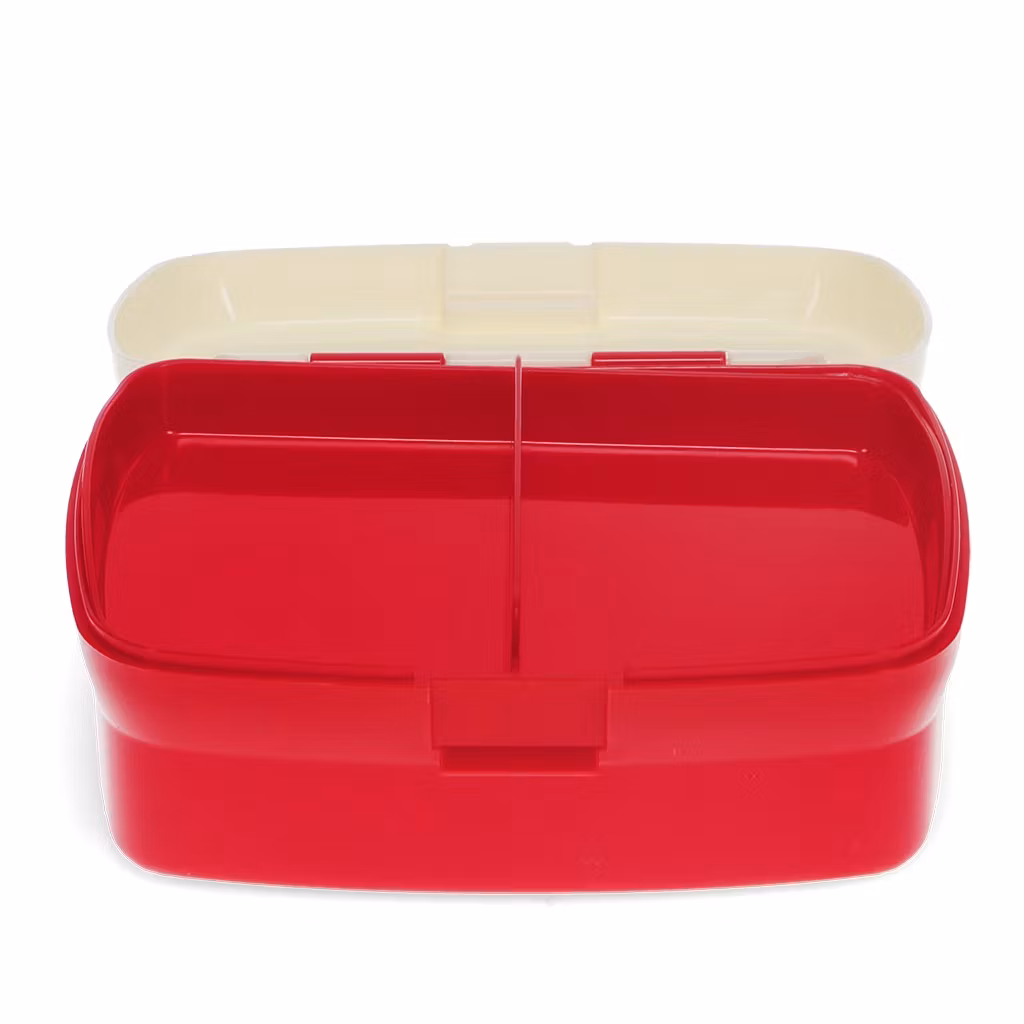 En matlåda med avtagbar bricka och gångjärnslock med färgglad tax.