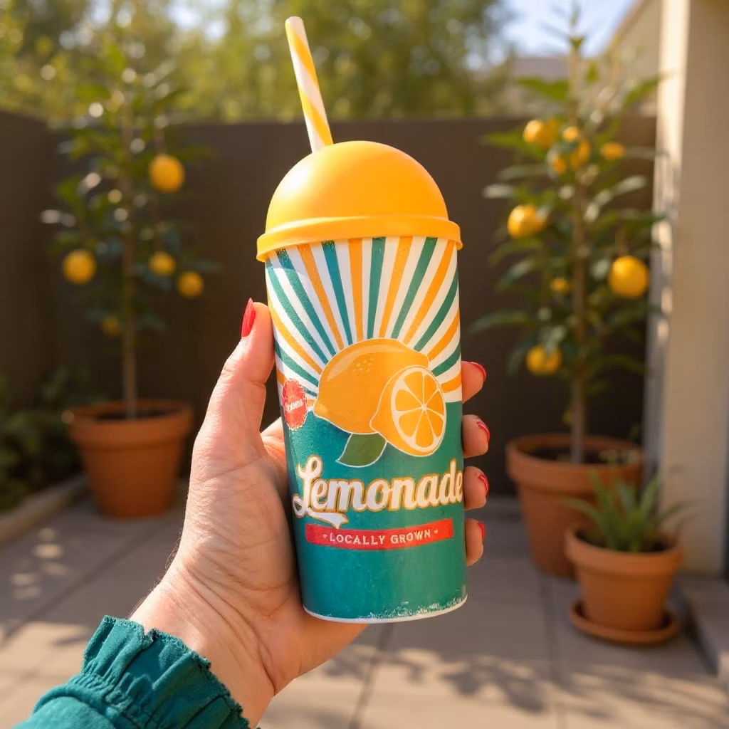 Ett härligt plastglas med lock och sugrör, dekorerat med ett fräscht citronmotiv som ger direkt sommarkänsla oavsett årstid. Glaset rymmer 470 ml och har ett runt, tätt lock som håller drycken på plats, medan det medföljande sugröret gör det enkelt och bekvämt att dricka utan spill. Perfekt för picknick, stranden, trädgården eller för att göra vardagens vattenpaus lite roligare. Glaset är lätt, tåligt och smidigt att ta med, och för att behålla motiv och kvalitet rekommenderas handdisk.