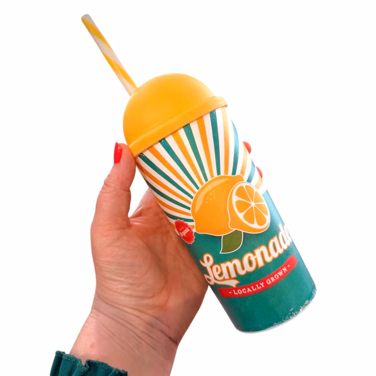 Somrigt plastglas med lock och sugrör, perfekt för picknick, strand och vardagsmys. Rymmer 470 ml. Handdisk rekommenderas.