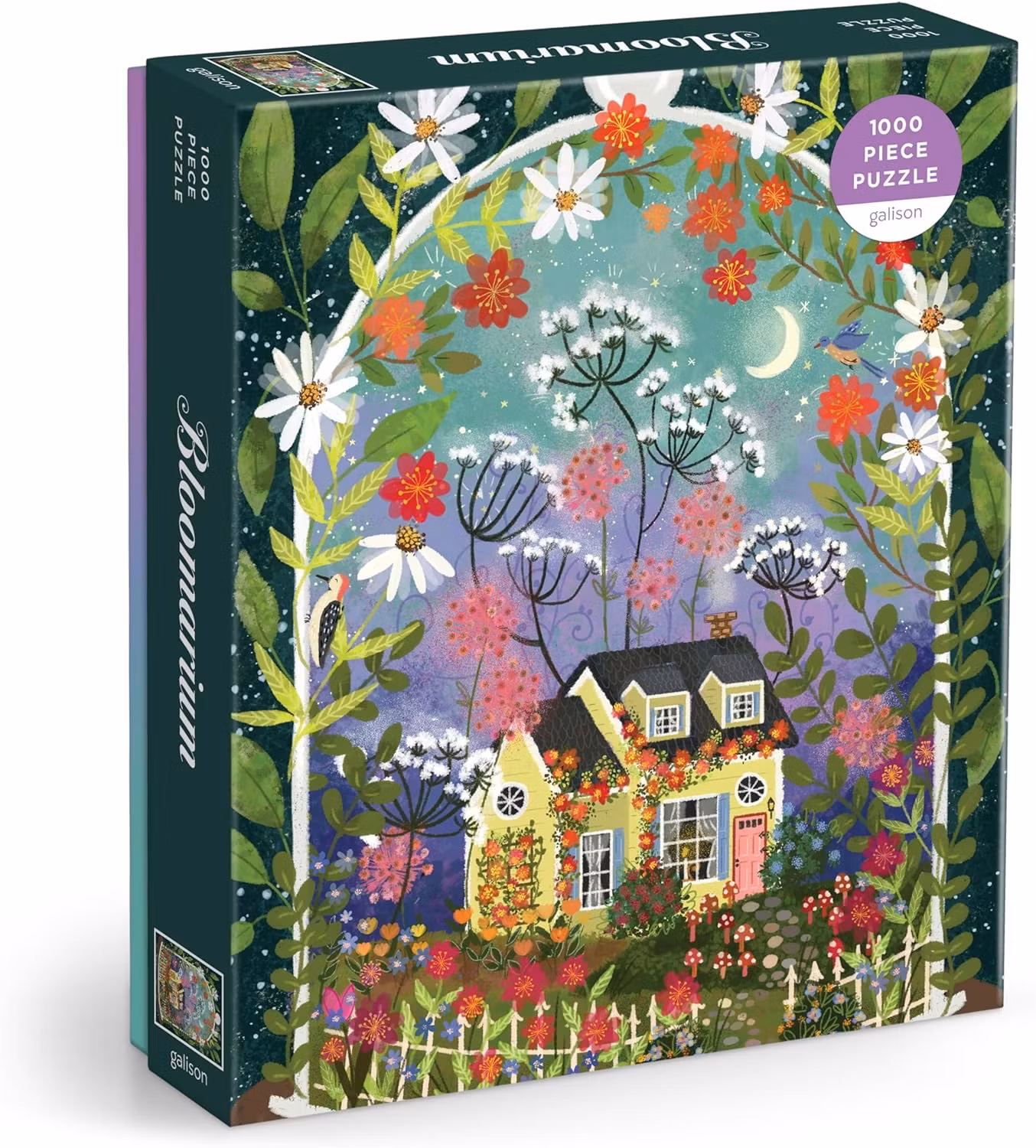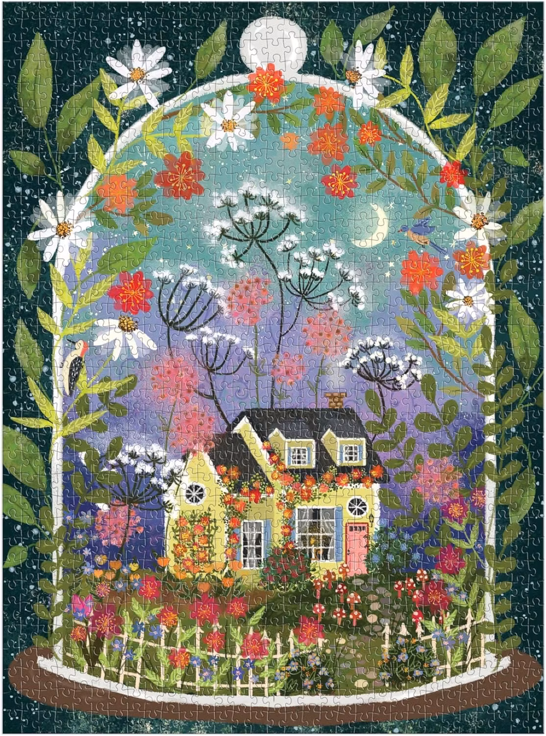 Pussel med motiv av ett hus i en glaskupa omgiven av blommor och grönska. Generös storlek och hela 1000 bitar.
