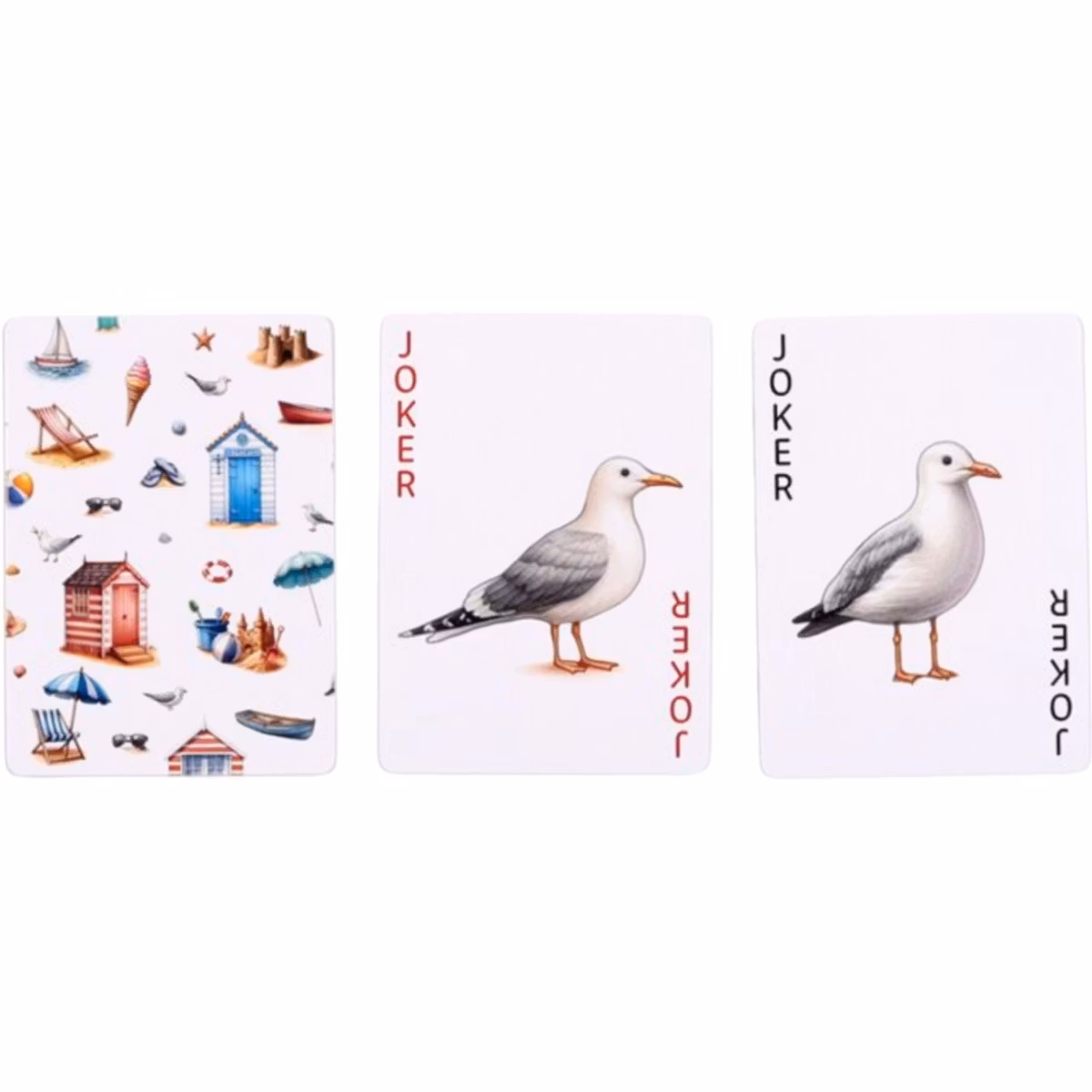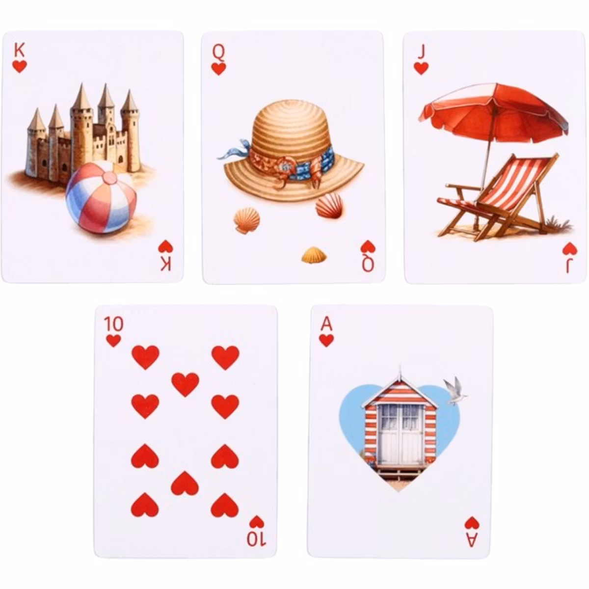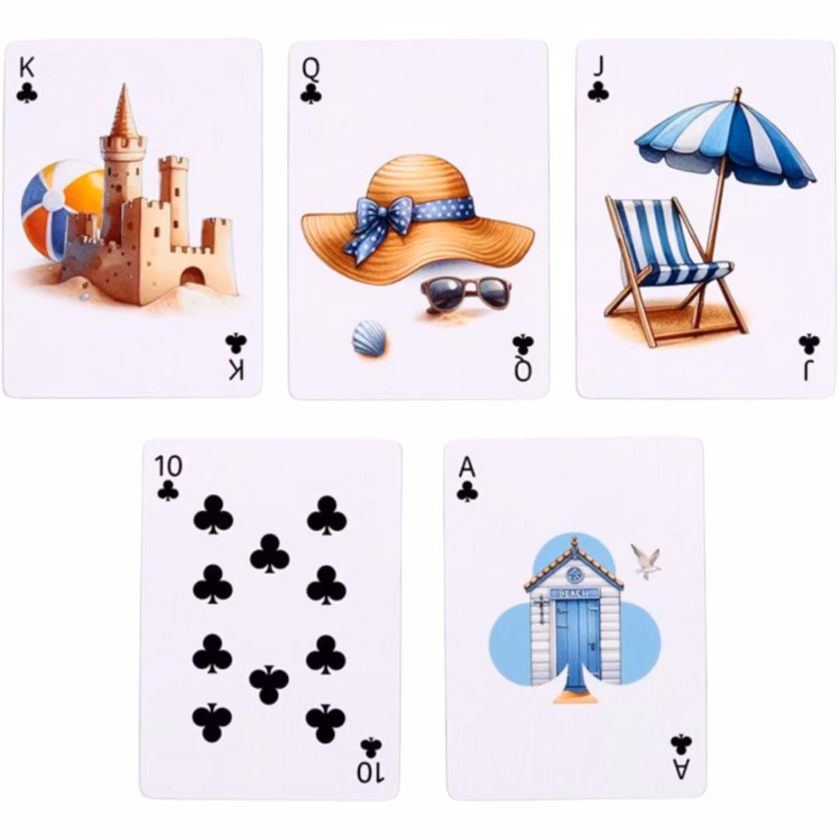 Den här kortleken är fylld av sommarkänsla från första stund, med en ask prydd av solstol och parasoll som direkt sätter stämningen. Kortens baksida är dekorerad med en mängd somriga symboler som badhytter, solglasögon, glassar, båtar och andra små detaljer som väcker glädje och semesterlängtan. Jokrarna har fått sina egna karaktärer i form av måsar, och de klädda korten är illustrerade med somriga symboler där klöver och spader går i friska blå toner medan hjärter och ruter lyser i varma röda nyanser. Resultatet är en kortlek som både är spelvänlig och full av personlighet – perfekt för strandväskan, picknickfilten, altanen eller som en present till någon som älskar sol, hav och lekfull design.