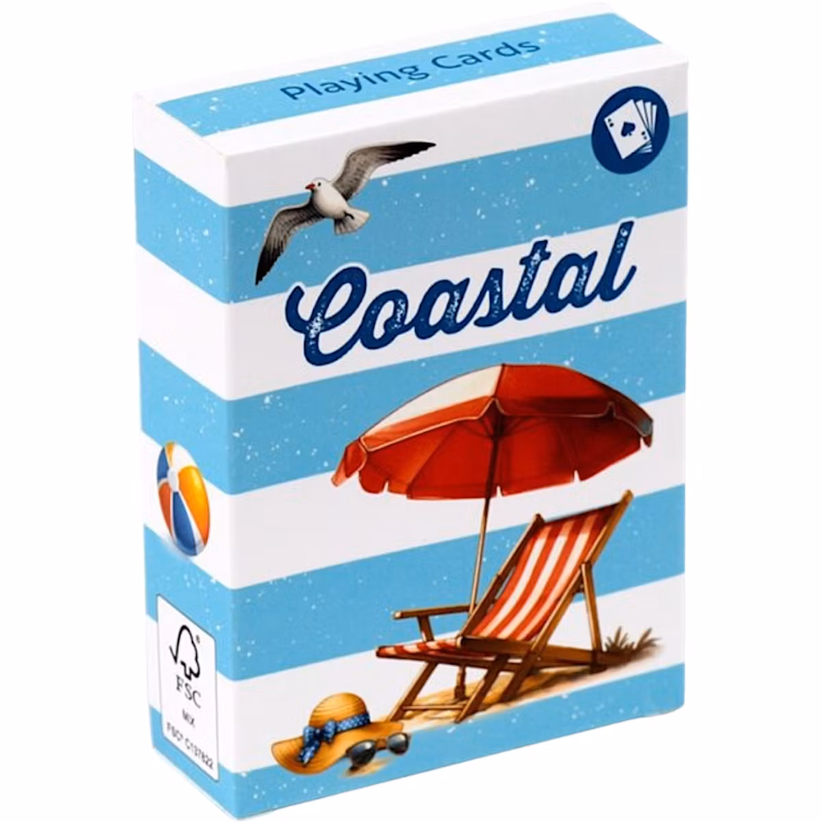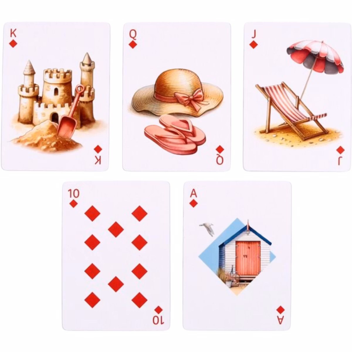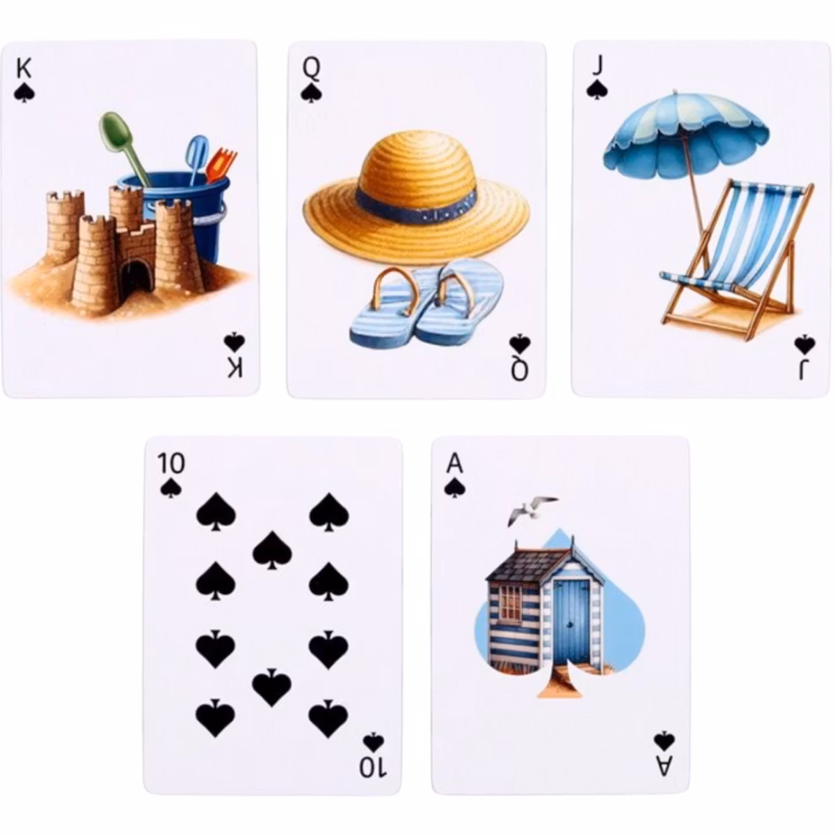 Den här kortleken är fylld av sommarkänsla från första stund, med en ask prydd av solstol och parasoll som direkt sätter stämningen. Kortens baksida är dekorerad med en mängd somriga symboler som badhytter, solglasögon, glassar, båtar och andra små detaljer som väcker glädje och semesterlängtan. Jokrarna har fått sina egna karaktärer i form av måsar, och de klädda korten är illustrerade med somriga symboler där klöver och spader går i friska blå toner medan hjärter och ruter lyser i varma röda nyanser. Resultatet är en kortlek som både är spelvänlig och full av personlighet – perfekt för strandväskan, picknickfilten, altanen eller som en present till någon som älskar sol, hav och lekfull design.