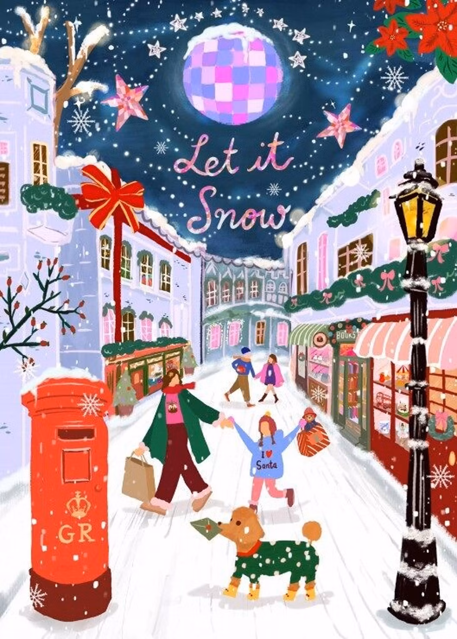 Det snöar över stadens butiksgata, och julstämningen är på topp. I detta charmiga pussel får du följa glada människor som julhandlar, småpratar och njuter av vinterluften – medan en liten söt hund tassar fram med ett brev i munnen, på väg mot brevlådan. Motivet är tecknat med tydliga konturer och fullmatat med detaljer, i ett format som mäter 48 x 34 cm. Med 500 bitar är det ett lagom projekt för en mysig kväll, och en perfekt present till den som älskar jul, stadsliv och fyrbenta vänner.