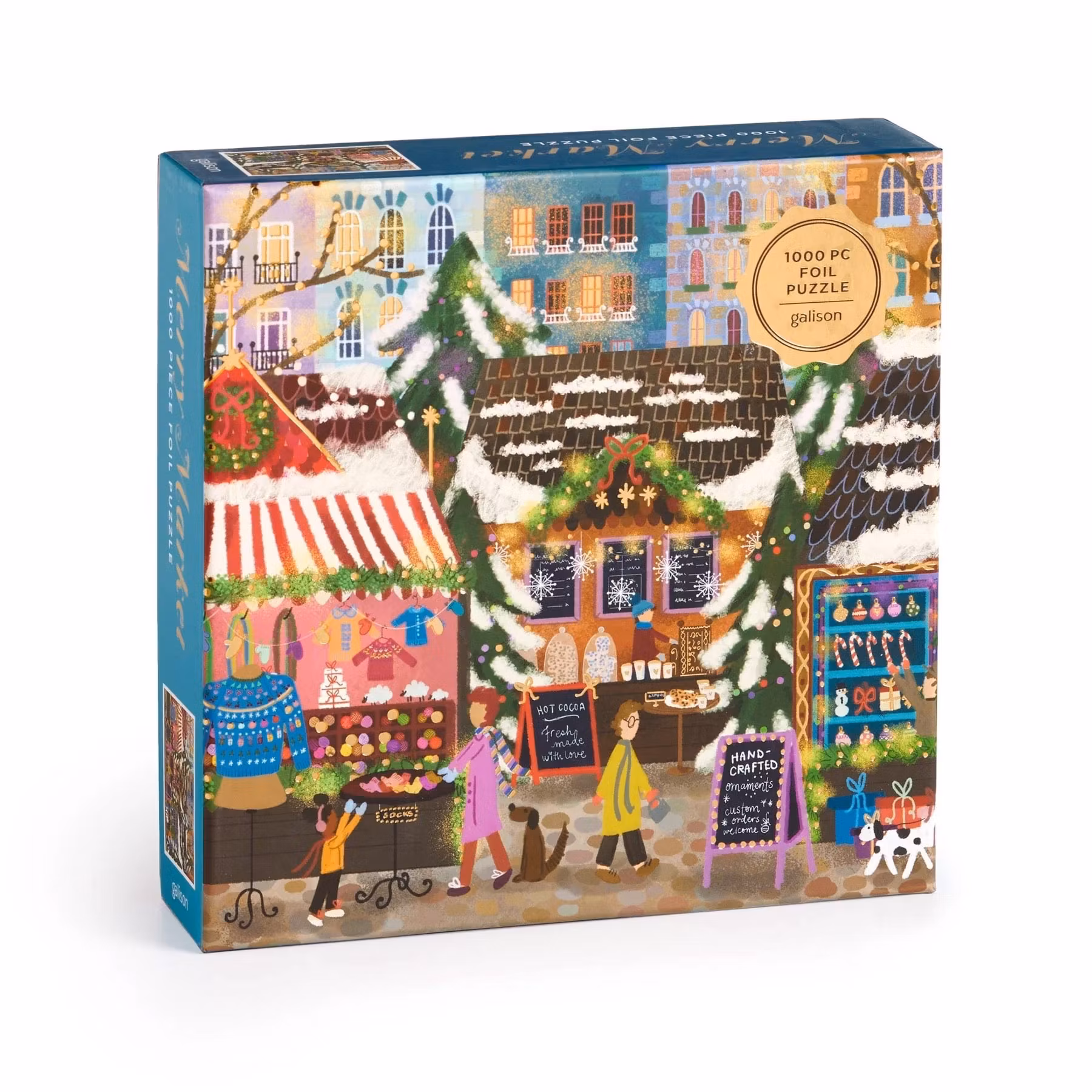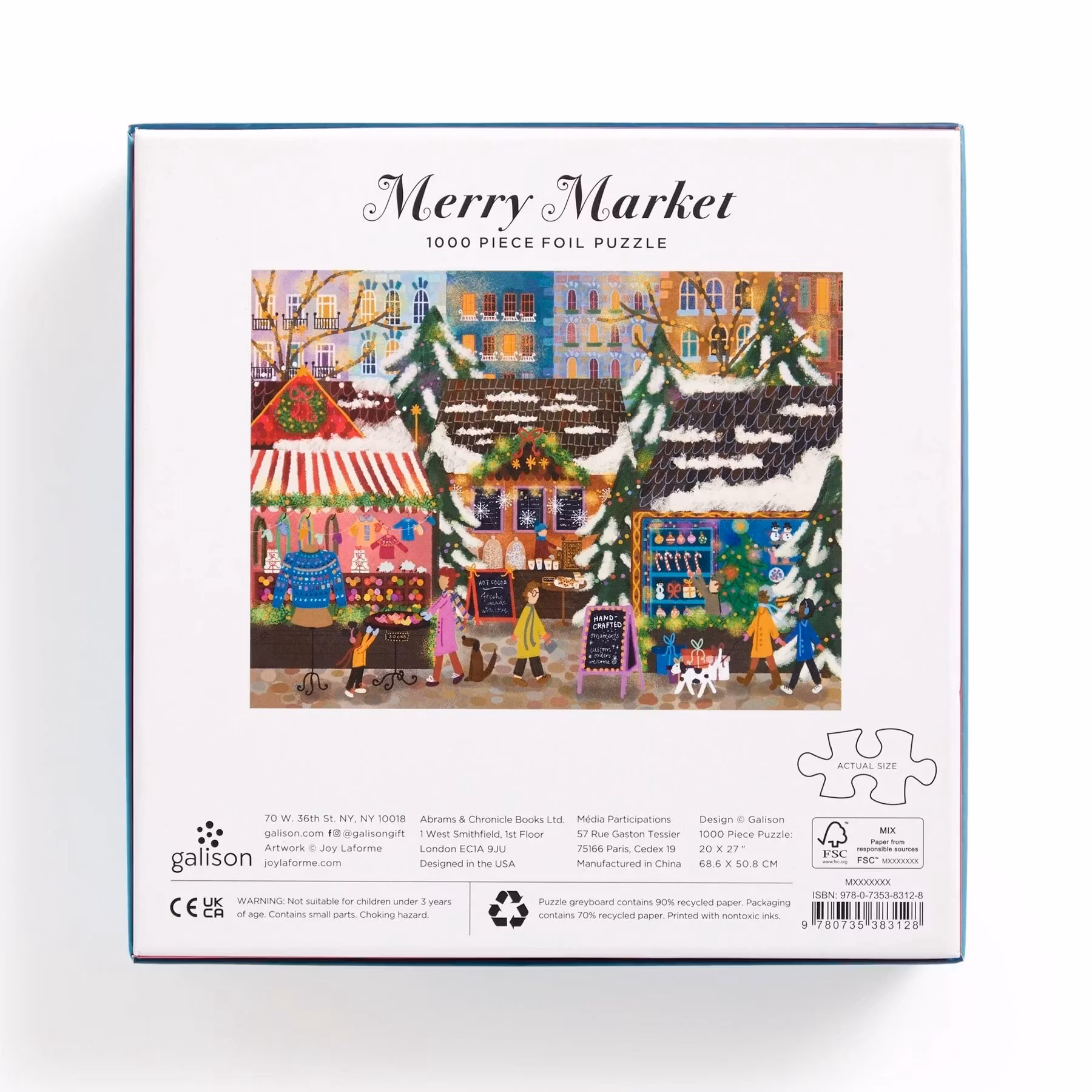 Njut av en julupplevelse med Merry Market 1000-bitars folie-pussel. Denna detaljrika marknadsscen med sina guldfolie-accenter kommer att sprida julglädje i