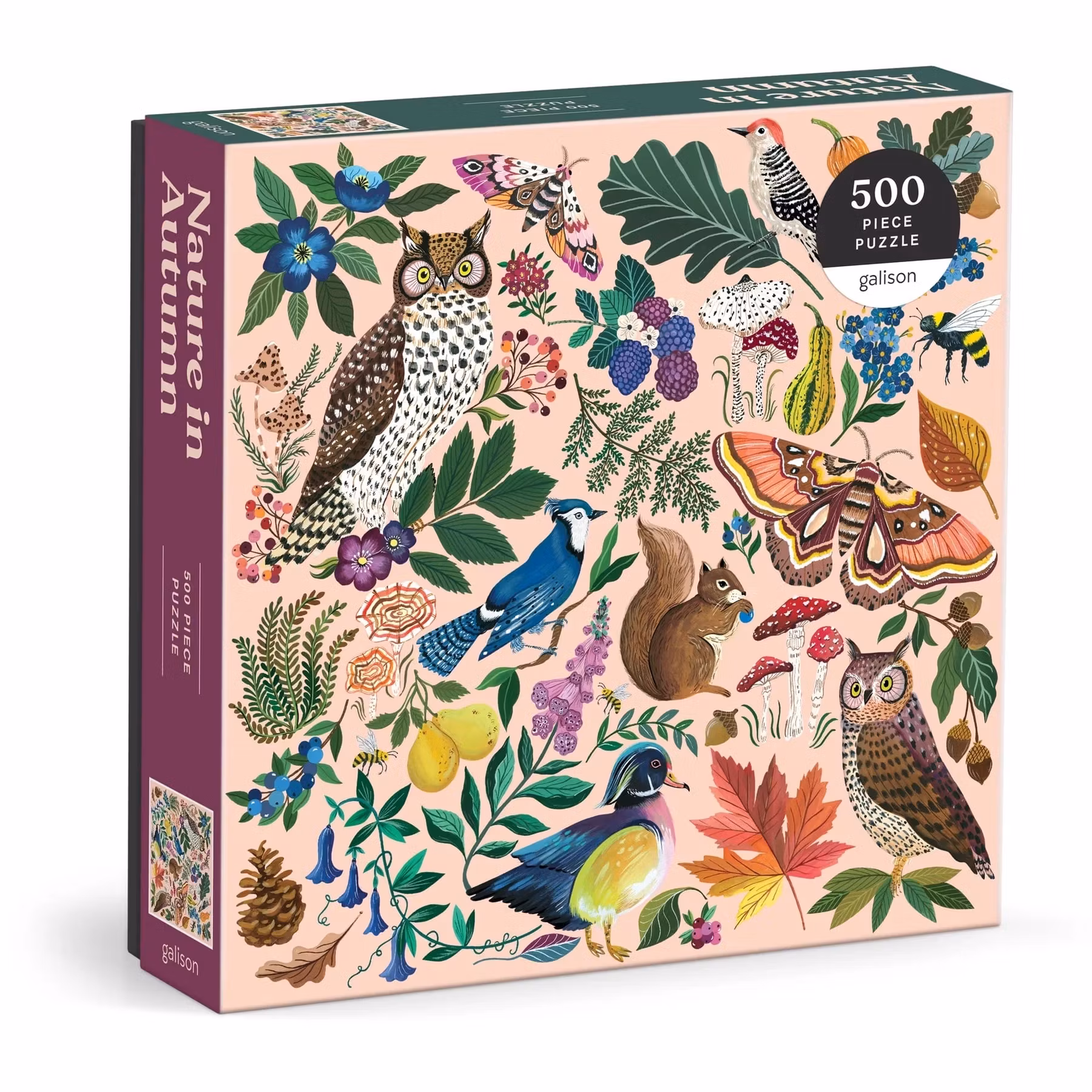 Detaljrikt pussel i höstens färgen med både blommor, löv och djur.Stl: 51 x 51 cmPris: 265:-Innehåller: 500 bitar