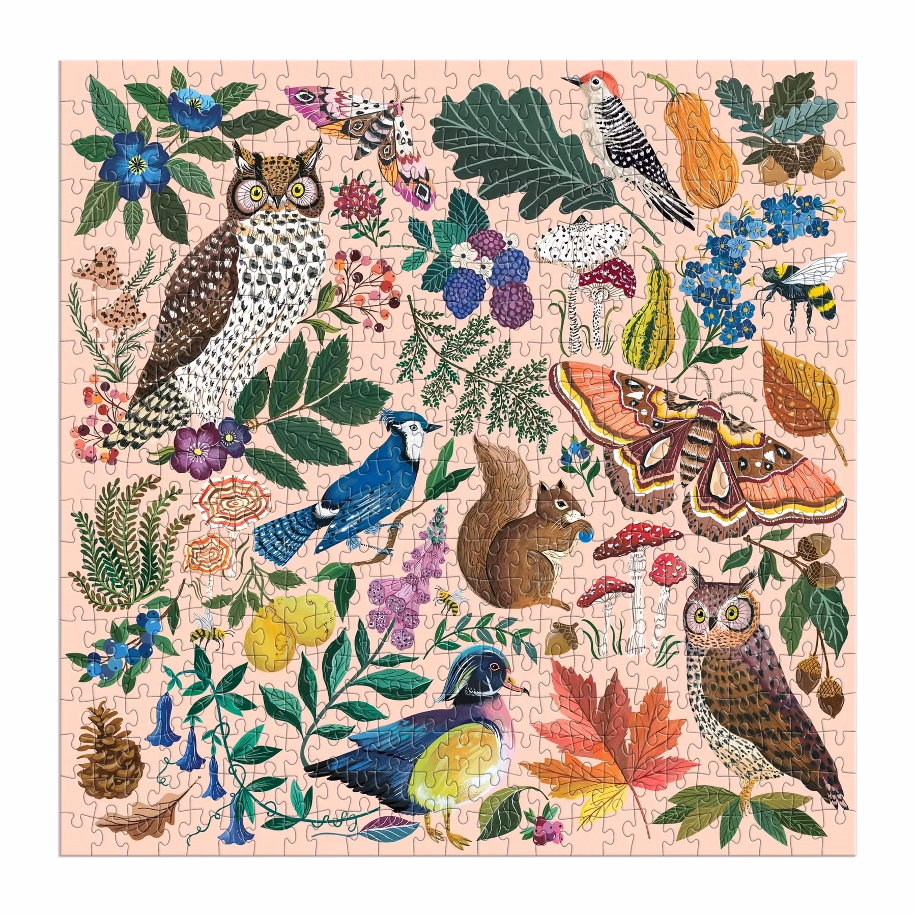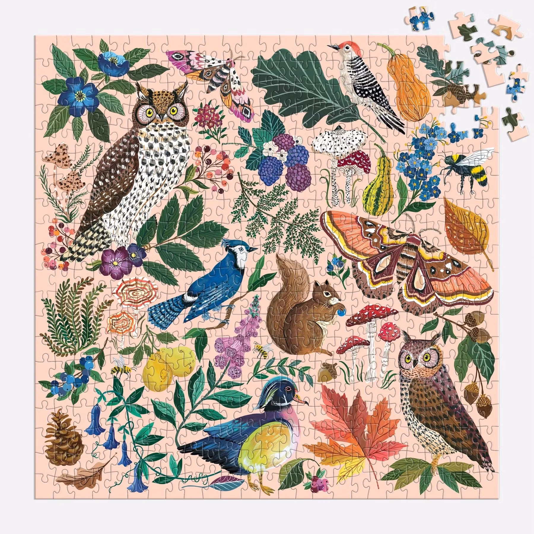 Detaljrikt pussel i höstens färgen med både blommor, löv och djur.