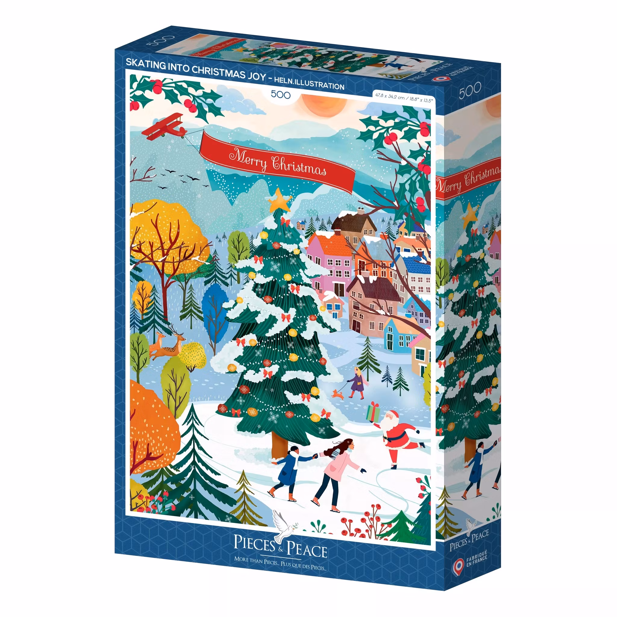 Det är full fart på isen! I detta charmiga julpussel glider jultomten fram på skridskor, medan två glada personer snurrar runt en stor julgran mitt på torget. I bakgrunden syns en vintrig by med små djur, snöklädda träd och ett rött flygplan som svischar över himlen. Motivet är tecknat med tydliga konturer och fullmatat med detaljer som får varje bit att leva. 500 bitar, 48 x 34 cm – ett perfekt pussel för dig som älskar julens energi, rörelse och glädje!