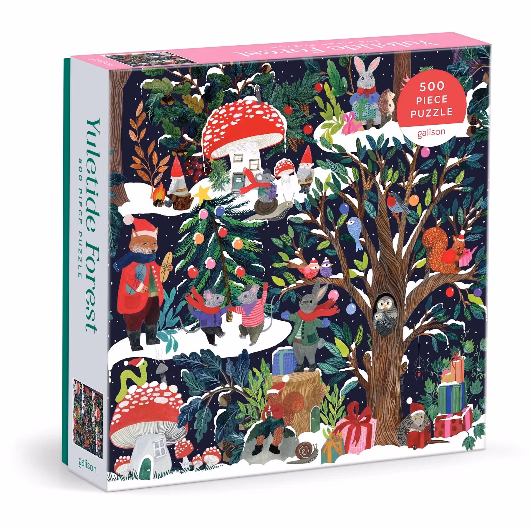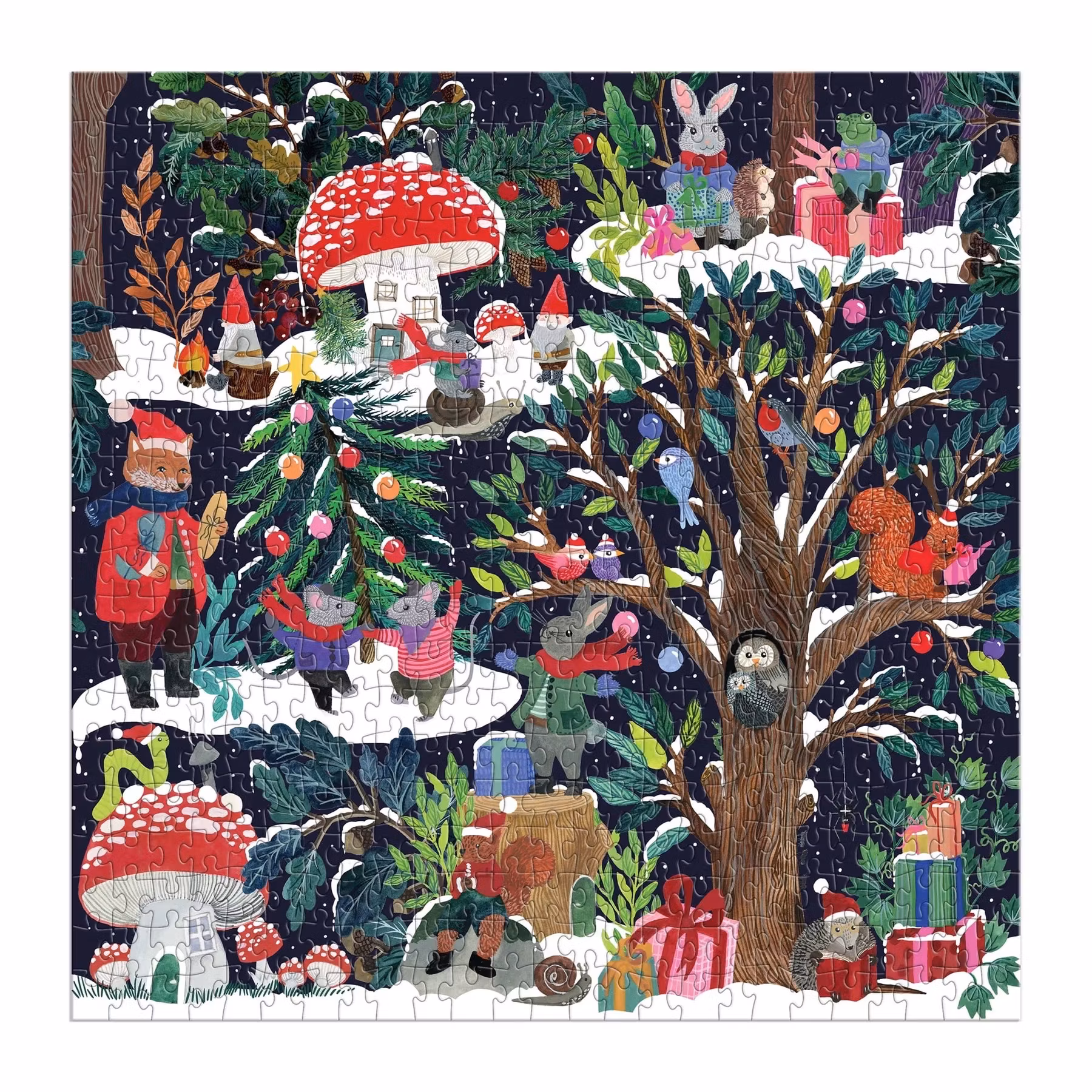 Dyk in i en vintersaga med detta pussel som visar en skog med svampar och träd täckta av snö.Med en massa söta små djur i vinterkläder och tomteluvor, är detta