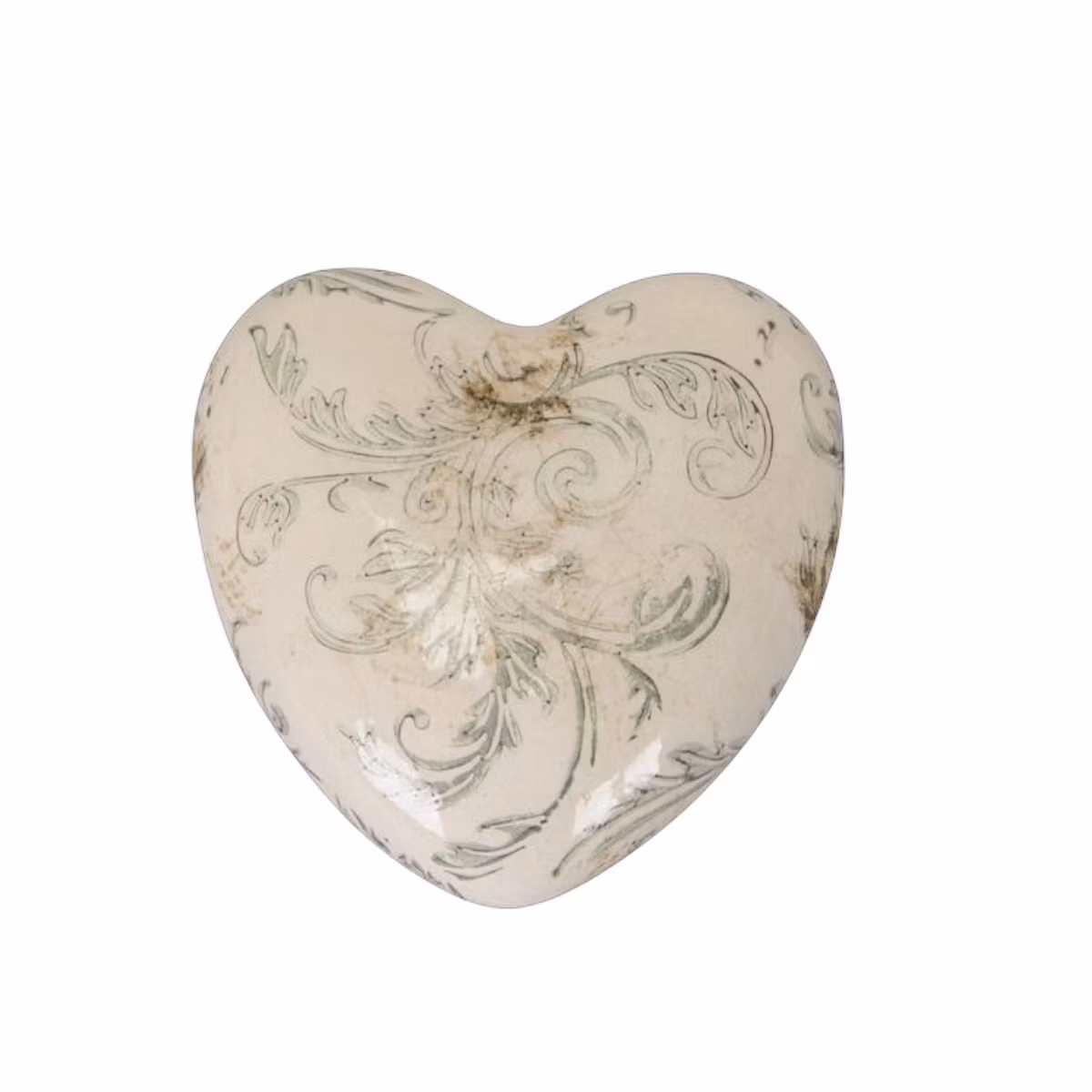 Sött hjärta i porslin med gröna blad, en fin liten inredningsdetalj.