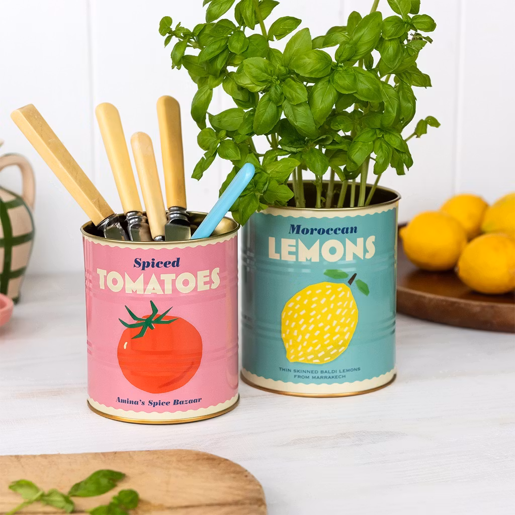 Liten förvaringsburk i metall med charmigt retro tomatmotiv, inspirerat av klassiska konservburkar. Perfekt för pennor, köksredskap, pyssel och småprylar.