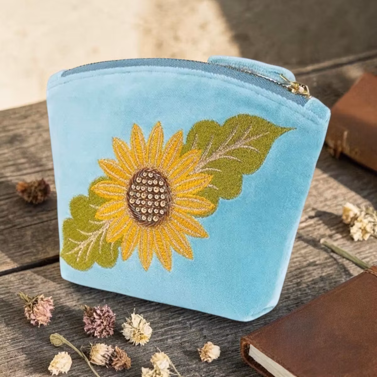 Denna charmiga lilla tygväska i mjuk, ljusblå sammet är en perfekt kombination av elegans och funktion. Den pryds av en vackert broderad solros med extra pärlbroderi som ger motivet ett exklusivt och handgjort uttryck. Med sina smidiga mått på 18×14 cm är den idealisk som liten sminkväska, börs eller som en praktisk organiserare i handväskan. Väskan är tillverkad i 100% polyester och är enkel att hålla fräsch – torka av den med en mjuk, torr trasa och undvik tvätt, strykning, blekning och kemtvätt för att bevara dess form och lyster. En söt och stilfull accessoar som tillför både färg och glädje i vardagen.