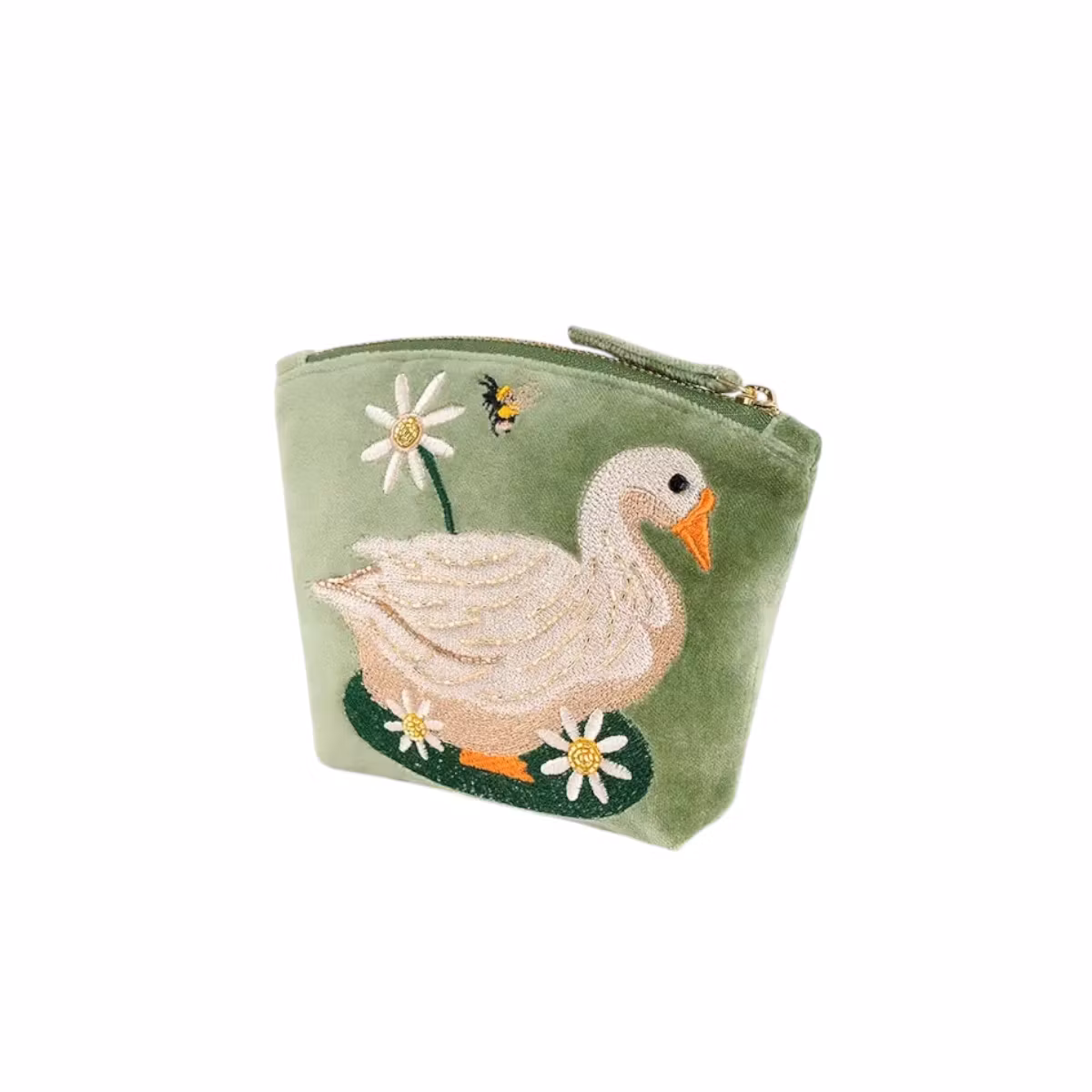 Denna lilla sammetsväska i mjuk, mossgrön sammet är en charmig och elegant accessoar som kombinerar praktisk funktion med ett lekfullt och detaljrikt motiv. Väskan pryds av en vackert broderad vit anka tillsammans med en liten humla och blommor, där pärlbroderade detaljer ger extra lyster och ett exklusivt handgjort uttryck. Med sina smidiga mått på 18×14 cm är den perfekt som liten sminkväska, börs eller som en organiserare i handväskan. Tillverkad i 100% polyester och enkel att hålla fräsch – torka av med en mjuk, torr trasa och undvik tvätt, strykning, blekning och kemtvätt för att bevara dess form och glans. En söt och stämningsfull liten väska som tillför både färg och personlighet i vardagen.