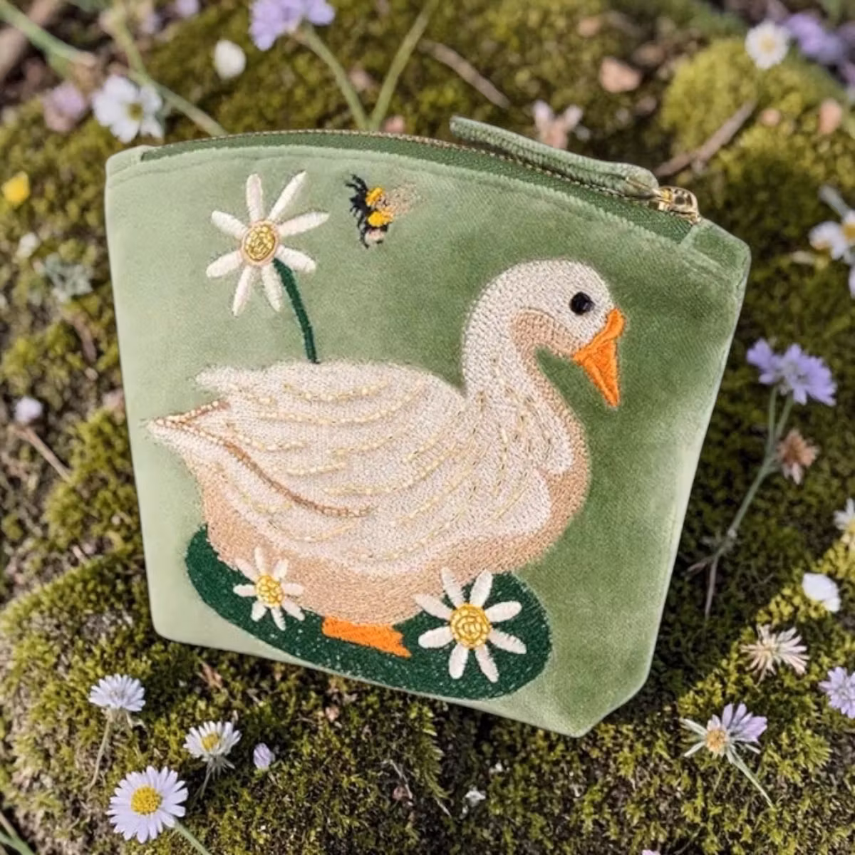Liten sammetsväska i mossgrön sammet med broderad vit anka, en liten humla och blommor. Extra pärlbroderi för vackra detaljer.