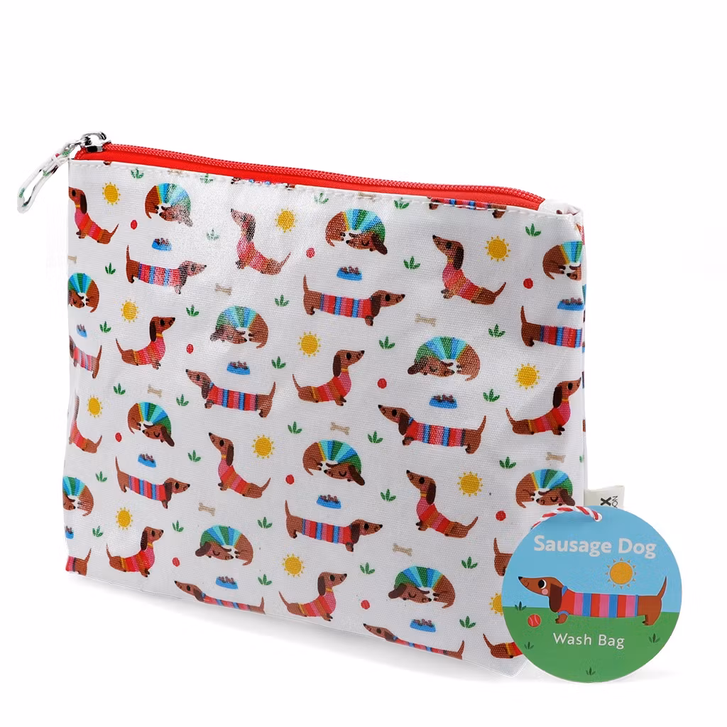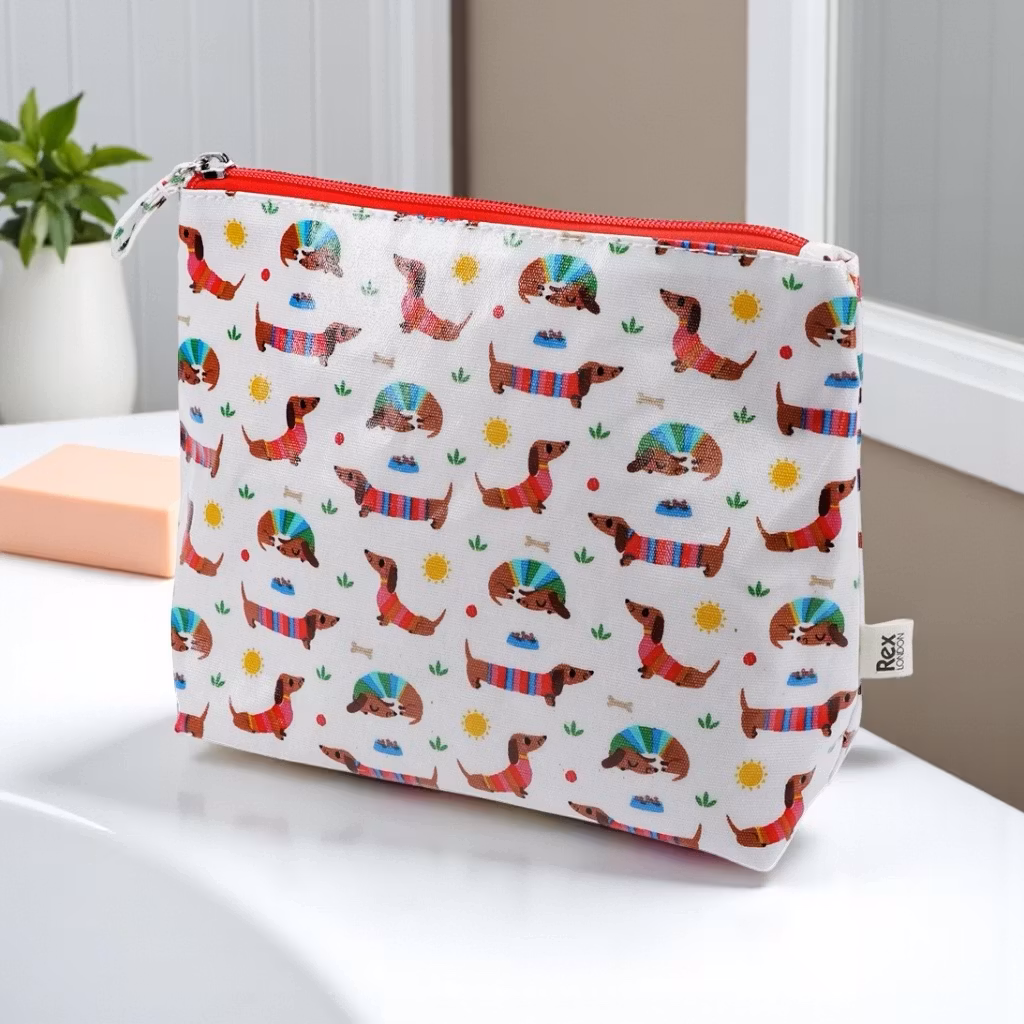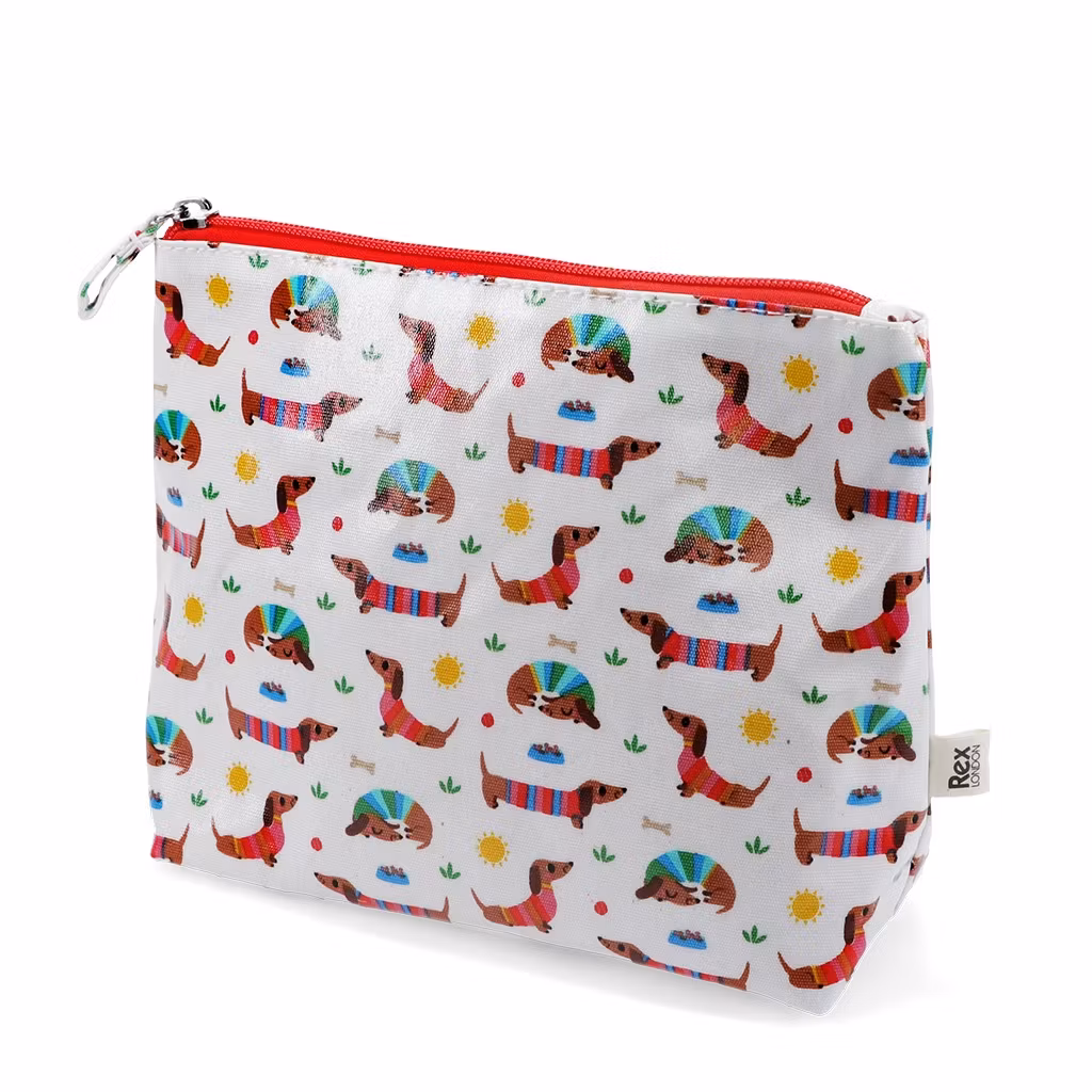 Packa med stil! Vår vita necessär med soliga taxar är perfekt för dina småsaker. Lätt, rymlig och fodrad med rött tyg.