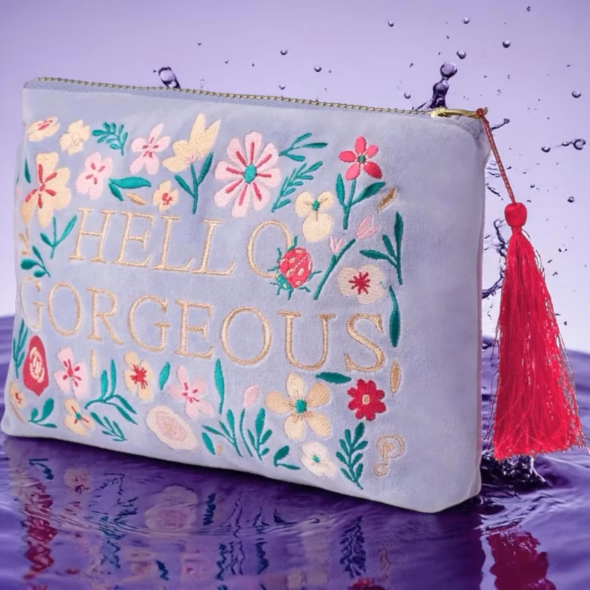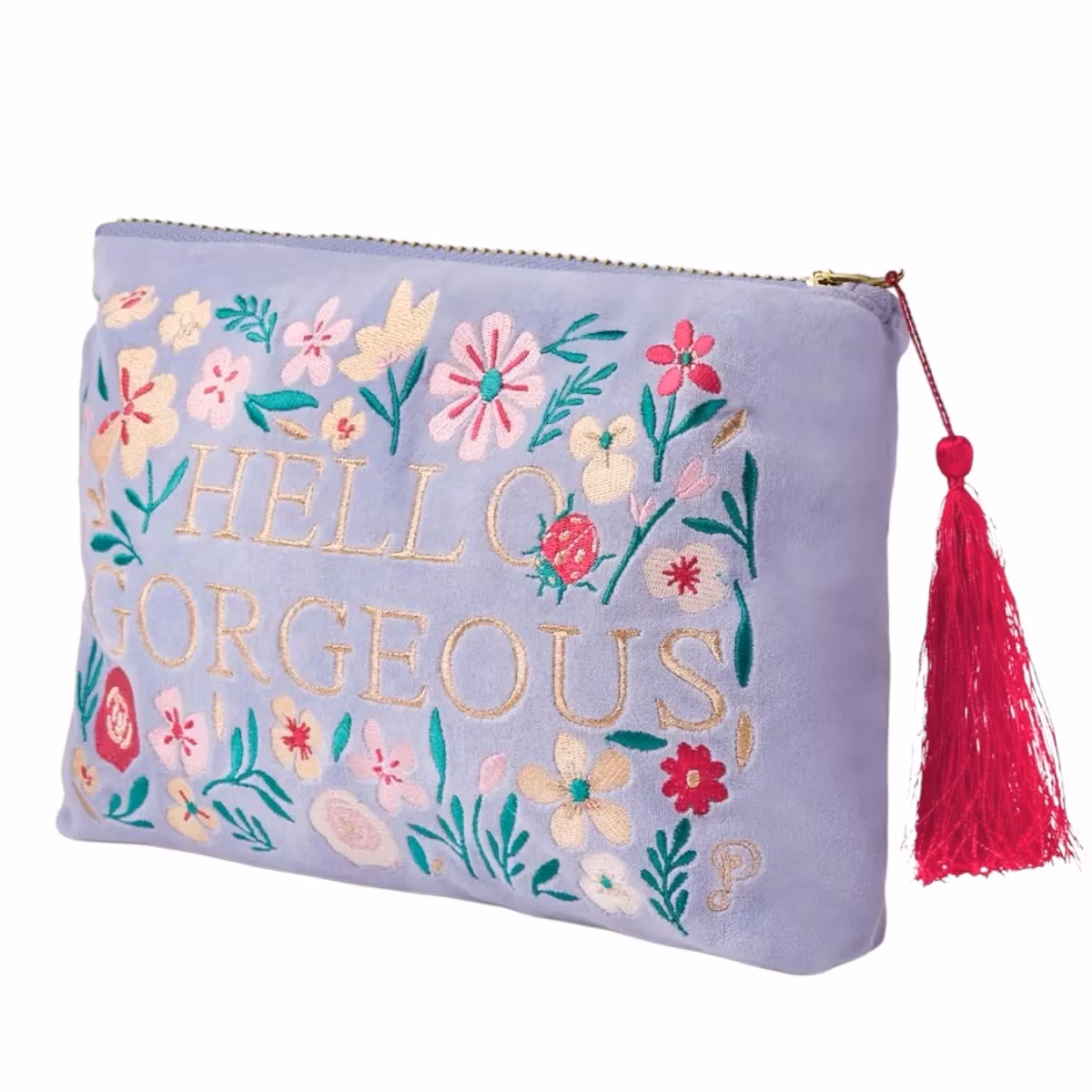 Elegant tygväska i mjuk sammet med vackert broderade blommor. Perfekt som sminkväska, necessär, liten börs eller organiserare i väskan